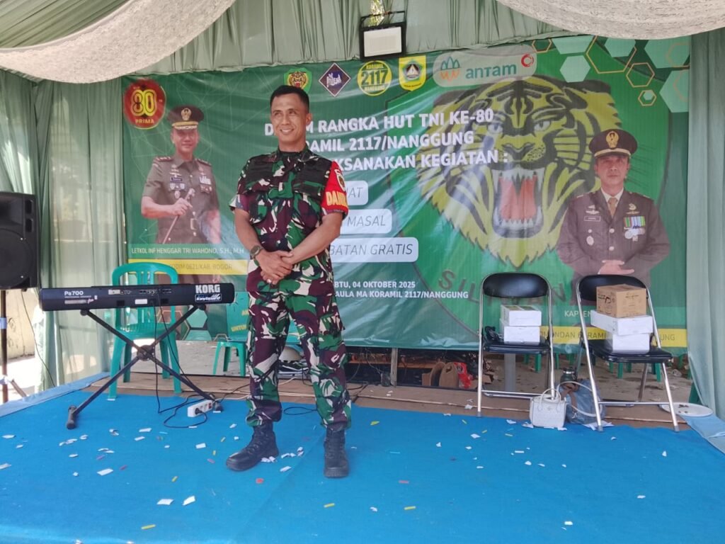 Swarabogor.com | Bogor,– Komando Rayon Militer (Koramil) 0621-2117/ Nanggung mengadakan serangkaian kegiatan sosial dan kemasyarakatan dalam rangka memperingati Hari Ulang Tahun (HUT) ke-80 Tentara Nasional Indonesia (TNI), yang jatuh pada 5 Oktober 2025. Acara yang bertema “TNI PRIMA, TNI RAKYAT, INDONESIA MAJU” ini dilaksanakan di Markas Koramil Nanggung, pada Sabtu (4/10/2025).