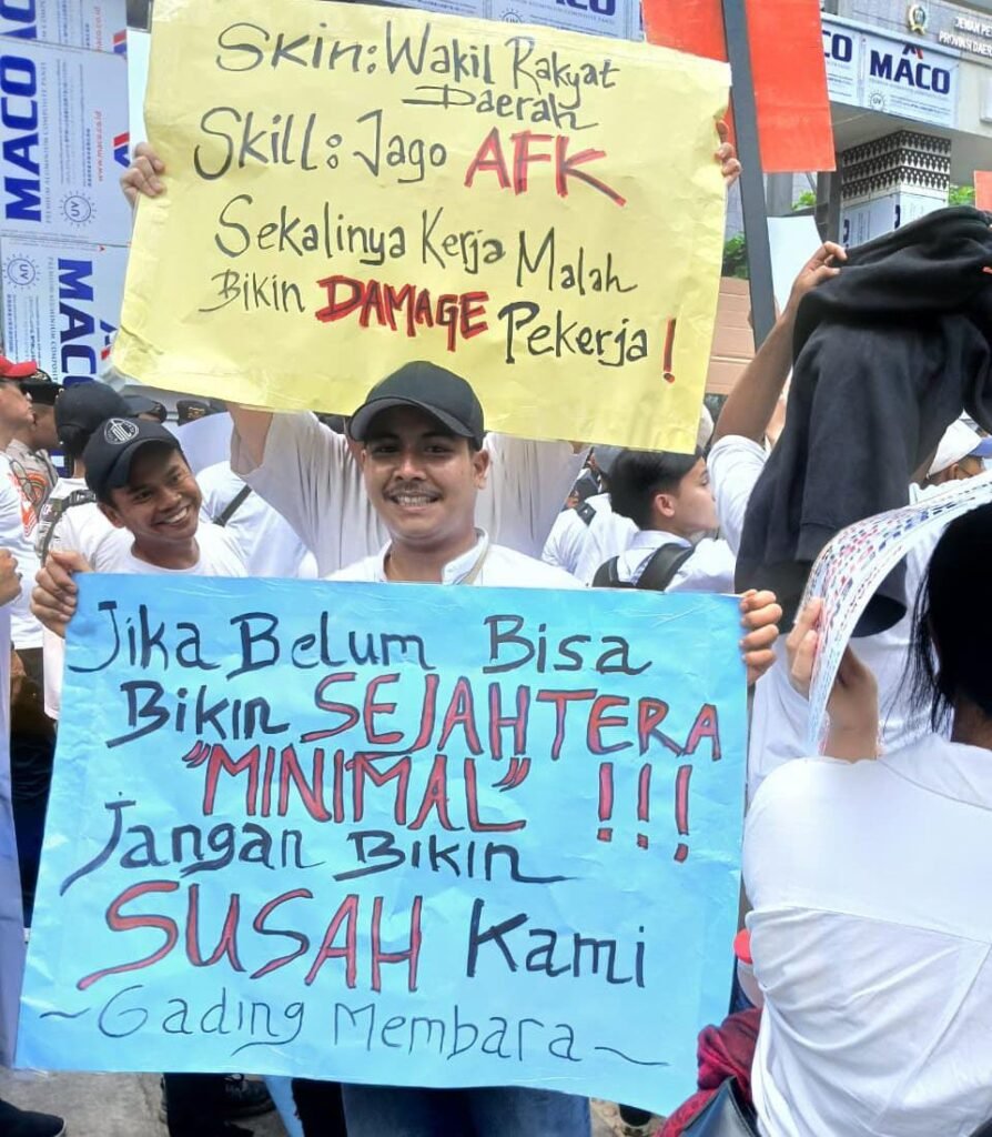 “Skin: Wakil Rakyat Daerah. Skil: Jago AFK. Sekalinya Kerja Malah Bikin Damage Pekerja !. Jika belum bisa bikin Sejahtera “Minimal” !!!. Jangan bikin susah kami. _Gading Membara_,”. Seruan aksinya.