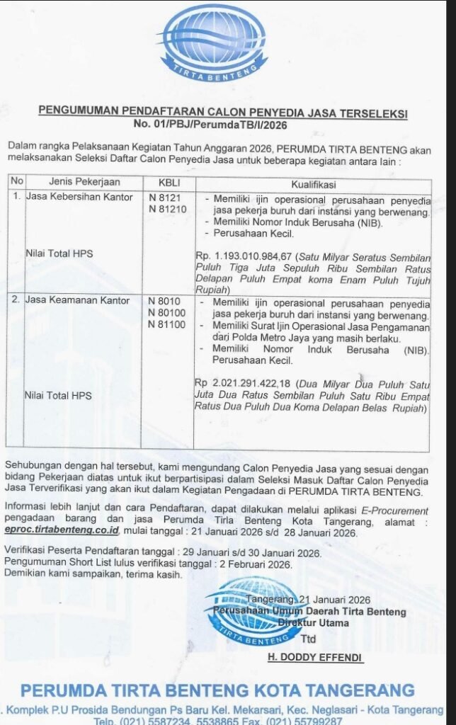 SwaraBogor.com | Tangerang – Dalam rangka mendukung pelaksanaan kegiatan Tahun Anggaran 2026, Perusahaan Umum Daerah (Perumda) Tirta Benteng Kota Tangerang secara resmi membuka Pendaftaran Calon Penyedia Jasa Terseleksi, sebagaimana tercantum dalam Pengumuman Nomor 01/PBJ/PerumdaTB/I/2026.