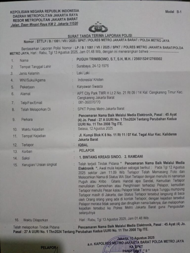 Pada pukul 01.48 Wib Dini hari, tanggal 13 Agustus 2025 , Puguh Triwibowo yang juga bergelar Dr. (c) Puguh Kribo, S.T., S.H., M.H., M.M., langsung mendatangi melaporkan ke Kepolisian Republik Indonesia Resort Jakarta Barat atas perlakuan yang tidak menyenangkan sesuai dengan nomor : STTLP/B/1061/VIII/2025/SPKT/POLRES METRO JAKARTA BARAT/POLDA METRO JAYA, dengan Tindak Pidana Pencemaran Nama Baik Melalui Media Elektronik, dan langsung diterima oleh APH yang sedang piket pada Polres Jakarta Barat. Rabu 13/08/2025.