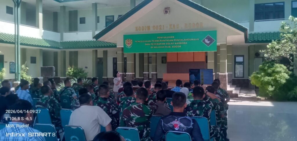 SwaraJabar.com | Cibinong – Dalam upaya preventif mempersempit ruang gerak peredaran gelap narkotika, Korem 061/Surya Kencana menyelenggarakan kegiatan Sosialisasi Pencegahan, Pemberantasan, Penyalahgunaan, dan Peredaran Gelap Narkotika (P4GN) serta uji petik tes urine. Kegiatan tersebut dipusatkan di Lapangan Apel Makodim 0621/Kab. Bogor, Selasa (13/4/2026).